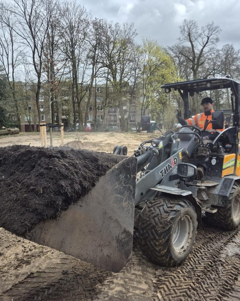 Op dit moment zijn we bezig met het mulchen van het terrein. Dit zorgt voor een betere bodemstructuur, helpt vocht vast te houden en geeft het geheel direct een verzorgde uitstraling.